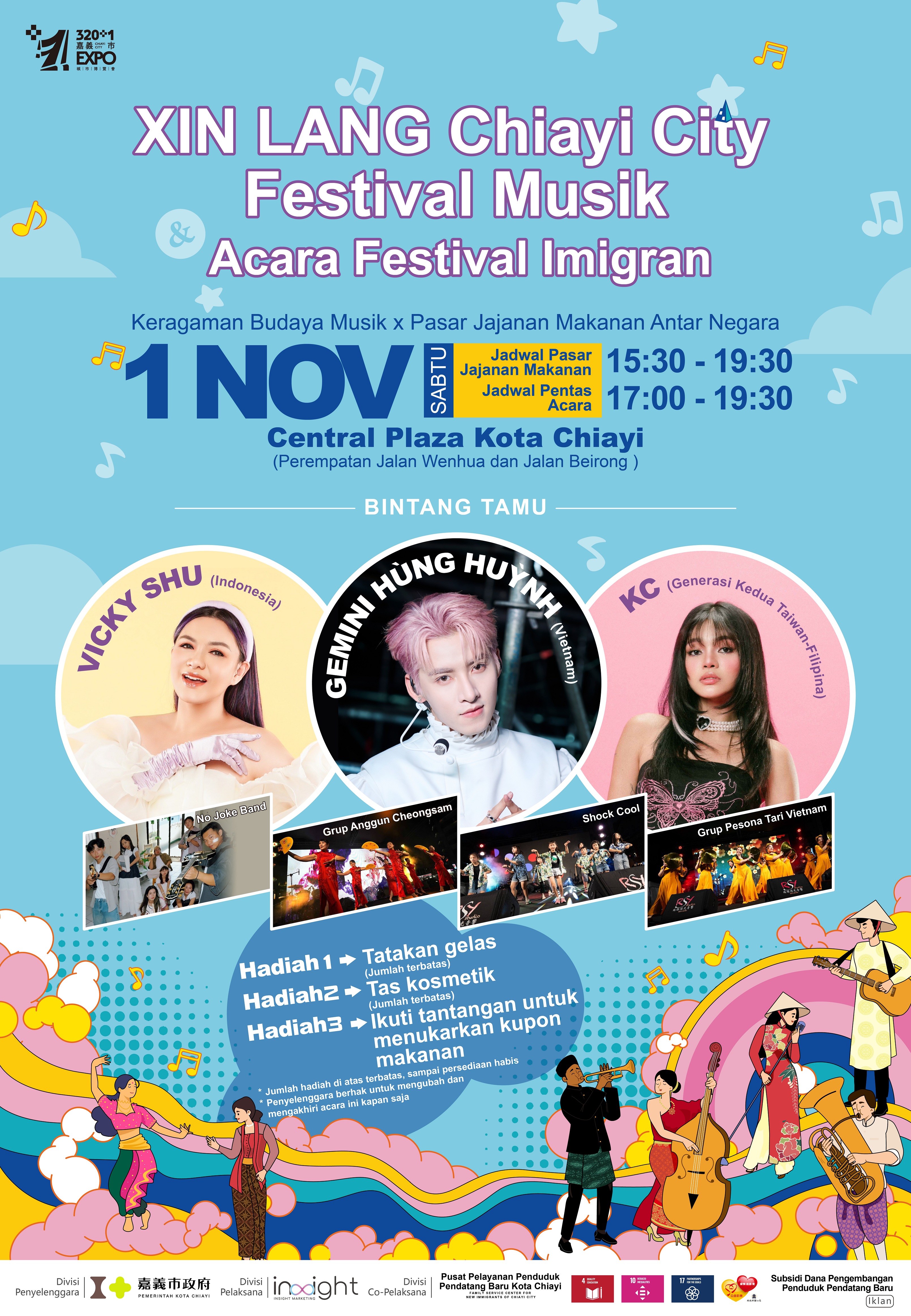 二、旨揭活動訂於114年11月1日(星期六)15時30分至19時30分假嘉義市中央廣場(嘉義市文化路與北榮街口)辦理,活動邀請來自越南、印尼的異國歌手、新住民及新二代表演團體,以音樂舞蹈的交流形式進行異國音樂文化演出,並設置異國美食文創市集攤位,推動多元族群共融,請協助宣傳並踴躍參加。