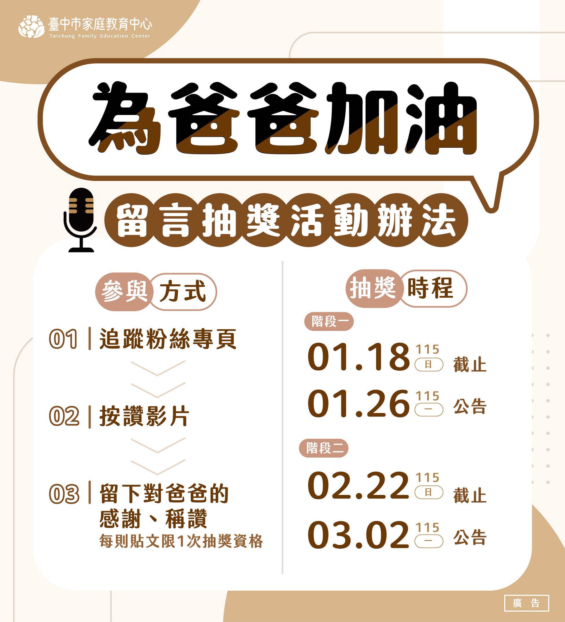 台中市家庭教育中心為深化社會大眾對父職角色的理解與支持,於歲末年初推出【為爸爸加油】系列短影音迷你劇,現正陸續上架播出。透過溫暖寫實的影像故事,描繪爸爸在不同育兒階段中的心聲與付出,傳遞「爸爸不是孤軍奮戰」的重要理念;市府教育局邀請民眾於活動期間觀看影片並留言分享「一句想對爸爸說的話」,即可參加抽獎,讓支持爸爸的心意化為實際行動。