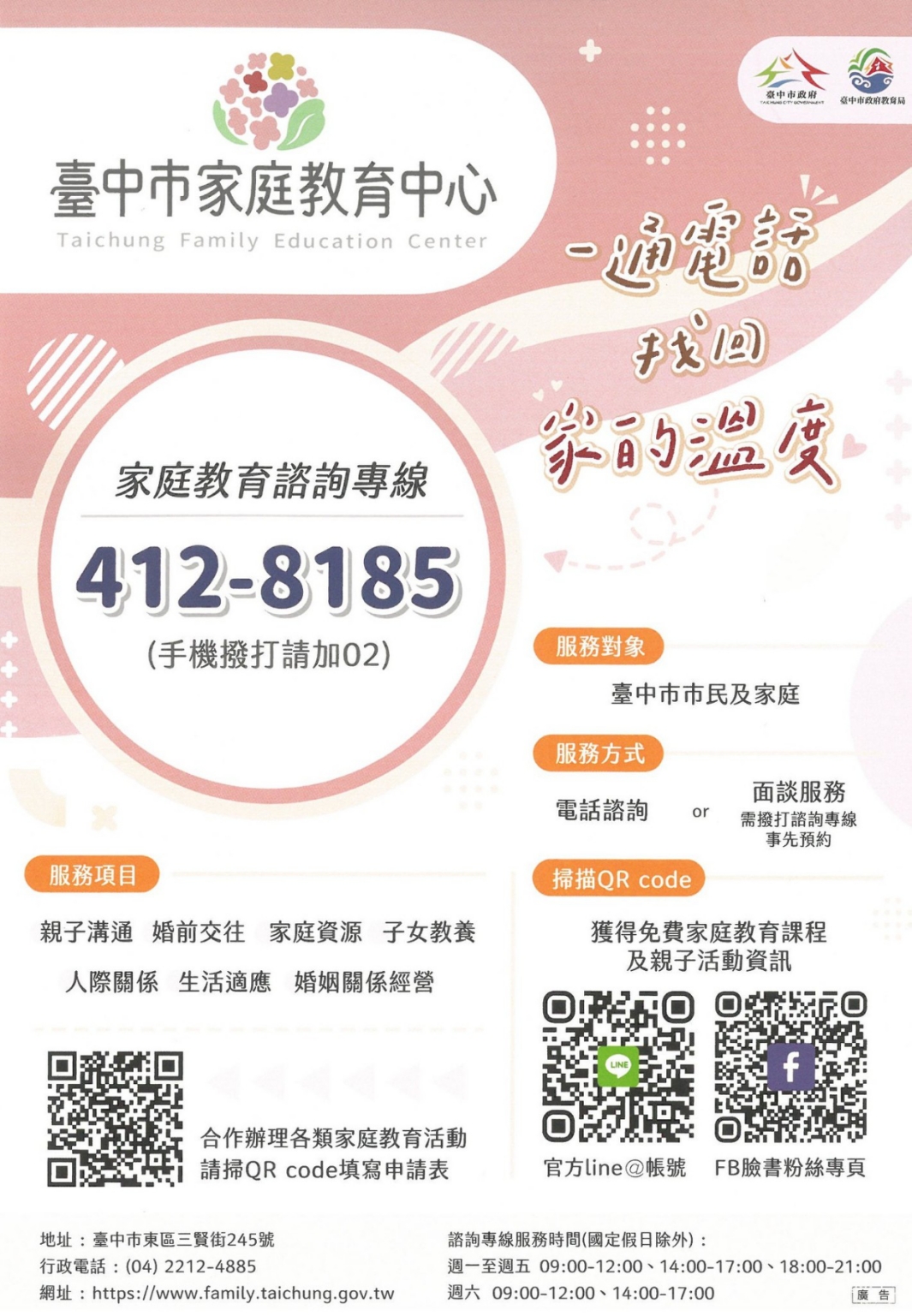 詳情請持續關注「台中市家庭教育中心」臉書粉絲專頁( https://share.google/OeCvnndUJtvnnAHFK )及LINE官方帳號( https://reurl.cc/3KGlOX ),掌握最新相關資訊。